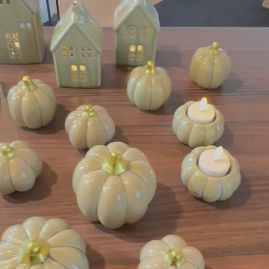 Skapa en mysig och inbjudande atmosfär hemma med denna dekorativa ljushållare i form av en pumpa. Låt värmeljuset sprida ett mjukt, varmt sken som fyller rummet med höststämning.